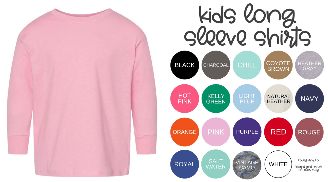 - Long Sleeve Shirts & Sweatshirts: 2T, 3T, 4T, 5/6, YS–YXL