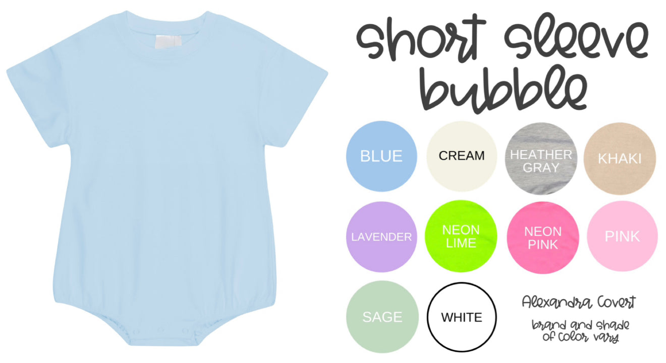 - Short Sleeve Bubbles: 0/3, 3/6, 6/12, 12/18, 2T, 3T