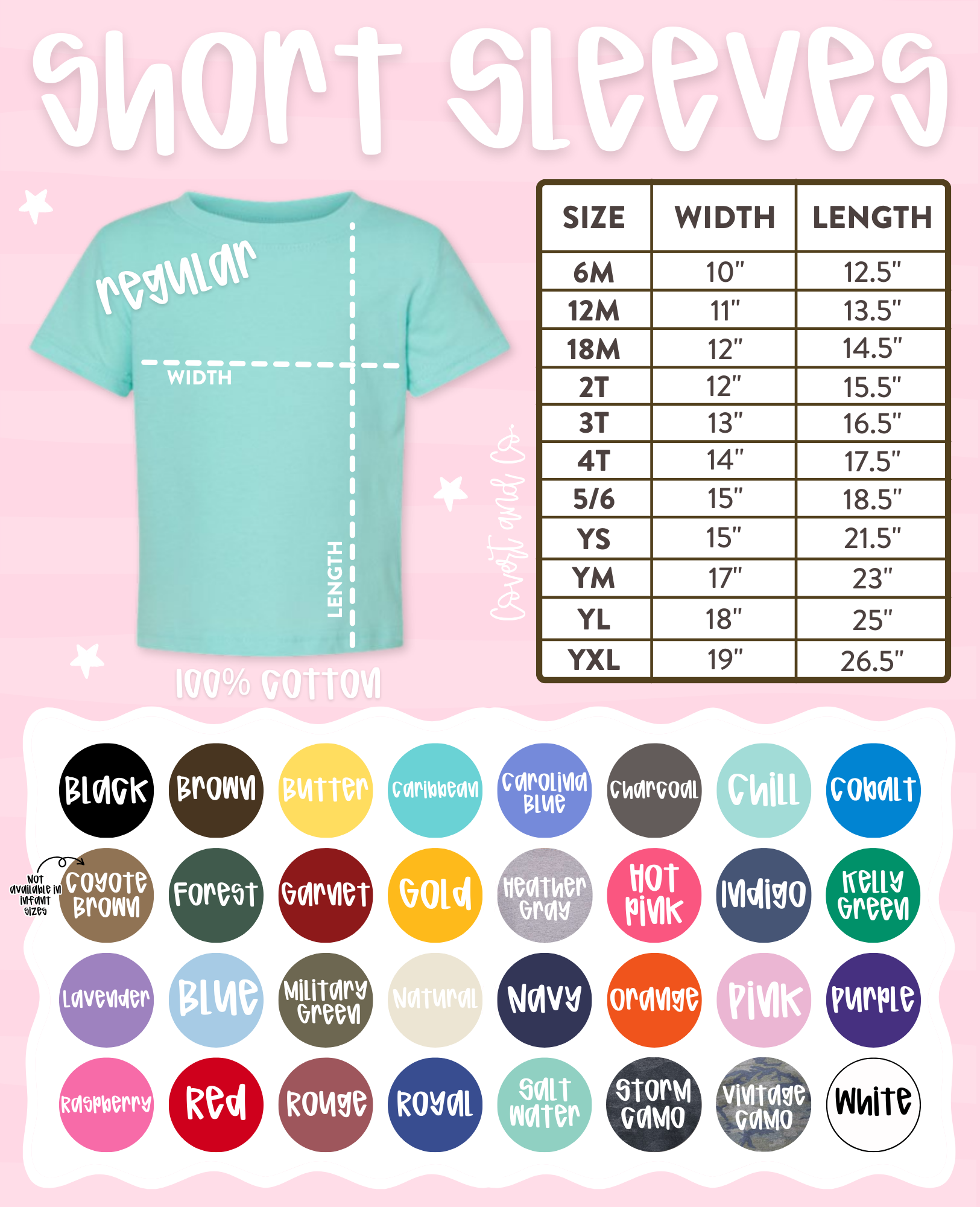 Please choose only colors that appear on the color chart for the specific style you are ordering. If a color is selected that is not listed on the correct chart for that style, the item in the order will be refunded.