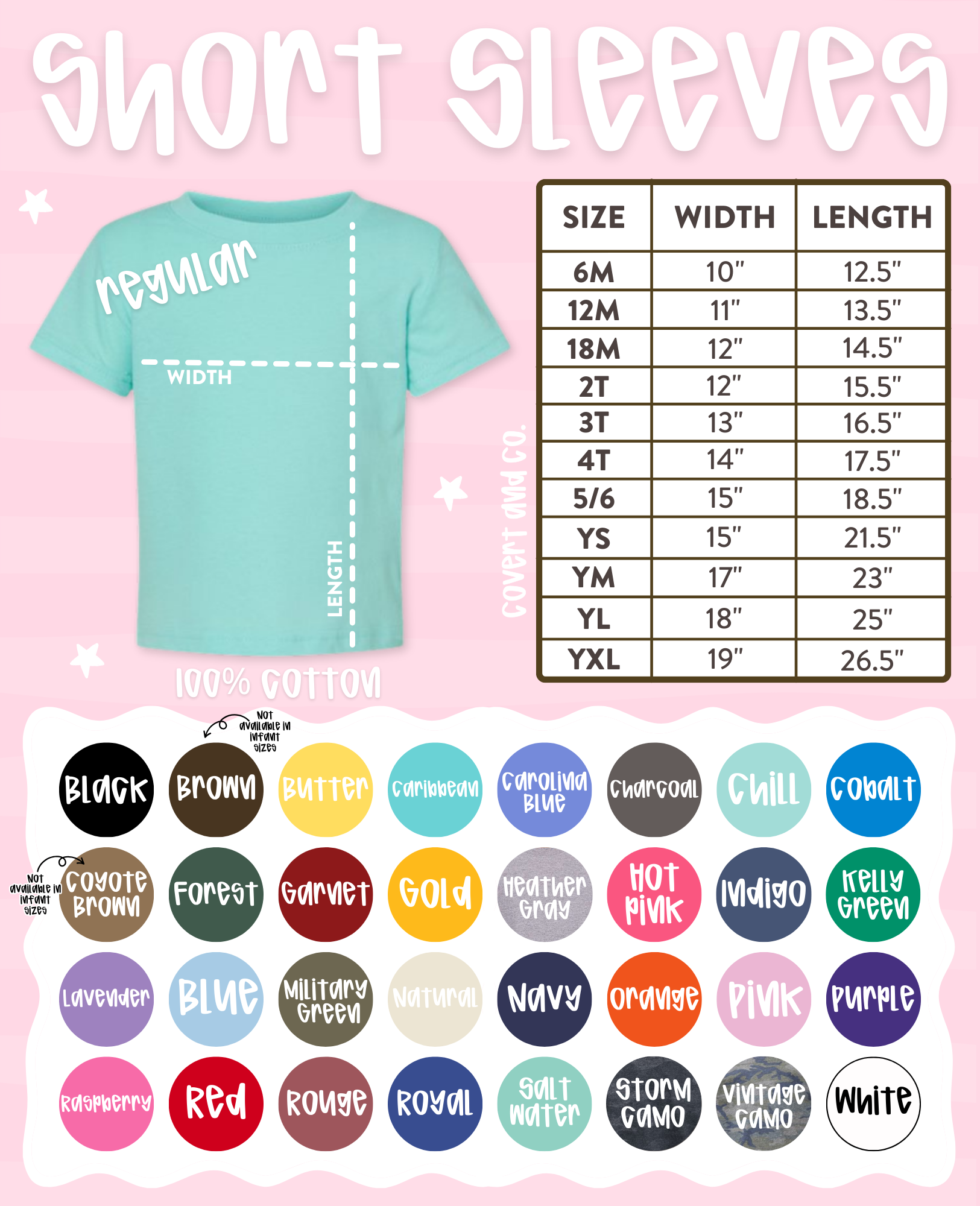 Please choose only colors that appear on the color chart for the specific style you are ordering. If a color is selected that is not listed on the correct chart for that style, the item in the order will be refunded.
